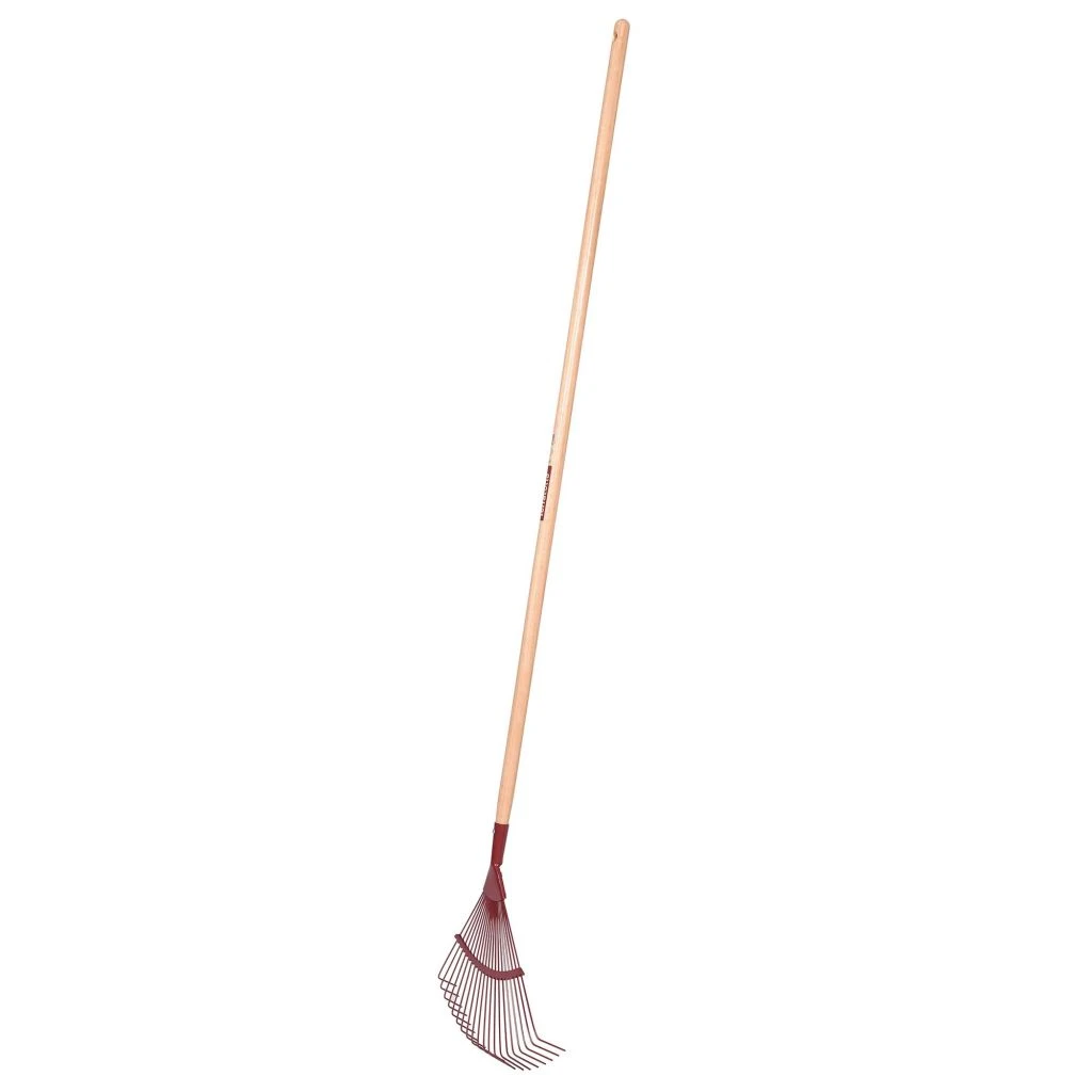 Le balai à gazon est un outil très utile pour conserver à la pelouse et au jardin en général un aspect bien net, en particulier après le passage de la tondeuse ou de la débroussailleuse, ou encore en automne lorsque les arbres se dénudent en laissant sur la pelouse, la terrasse et les allées une quantité non négligeable de feuilles mortes. Ce balai, par la rigidité de ses dents rondes et crochues, permet non seulement de ramasser tous les débris végétaux, mais aussi de scarifier la pelouse sans arracher le gazon, c’est à dire de gratter la terre en superficie et déloger les mousses qui ont tendance à se développer dans les zones plus humides et ombragées du gazon facilitant ainsi la régénération de la pelouse, ou encore de ramasser les petits déchets de taille. Ce modèle se compose d’un long manche en eucalyptus certifié PEFC 100 %, un bois réputé pour sa solidité, avec une emmanchure à douille où vient se fixer la tête à 20 dents, forgée dans un acier résistant. Le manche en ‘pomme’, arrondi à son extrémité, présente une percée qui permet de l’accrocher à un crochet ou à un clou. Il est compostable, la tête métallique est recyclable.