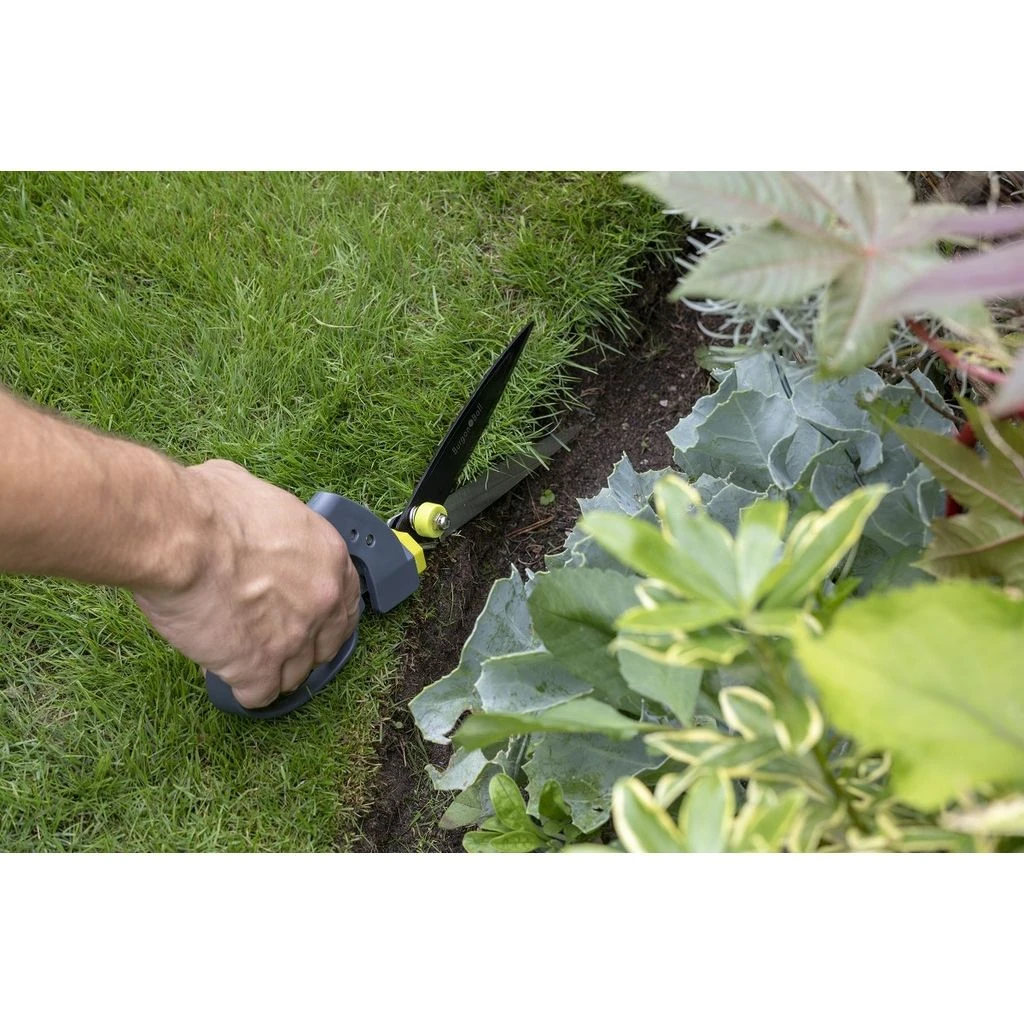 La cisaille à gazon manuelle est un outil de jardin complémentaire de la tondeuse, dont la tête en forme de ciseaux permet un travail de précision, en bordure d’allée, de terrasse ou de massif ainsi que dans les recoins trop étroits pour permettre le passage de la tondeuse. Ce modèle, équipé d’un mécanisme pour faire pivoter la cisaille, permet d’utiliser pleinement sa capacité de coupe, partout, en limitant les mouvements de torsion au niveau du poignet.