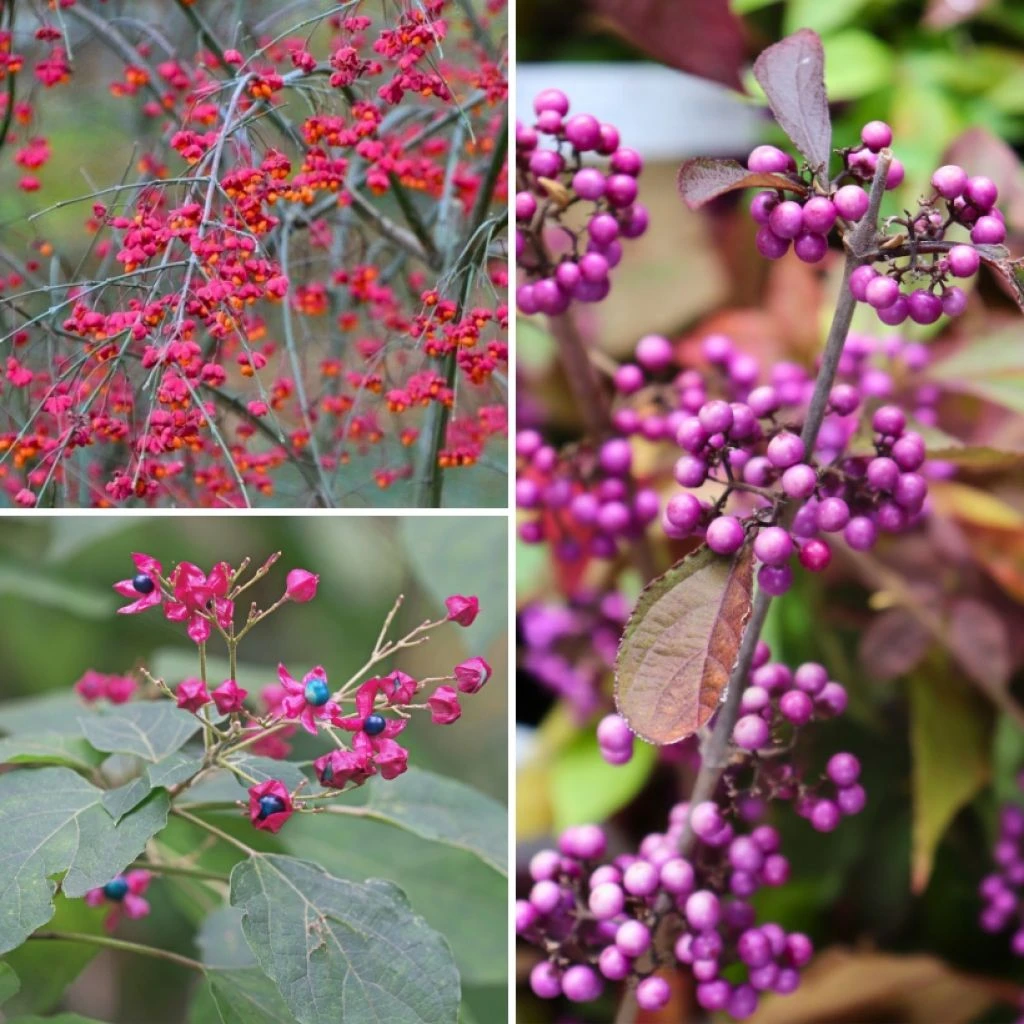 x 1 Callicarpa bodinieri ‘Profusion’ (Arbuste aux bonbons) : arbuste ne dépassant pas 2 m de hauteur, produisant de discrètes petites fleurs de couleur rose violacé en été. En octobre, ses rameaux se couvrent de baies d’un violet intense. Son feuillage prend de belles teintes automnales.