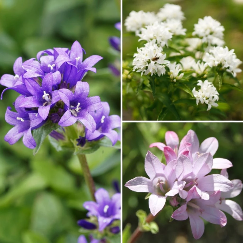 – x 1 Campanule glomerata ‘Caroline’ : variété aux fleurs simples de couleur rose pâle, rose franc à l’extrémité des pétales.