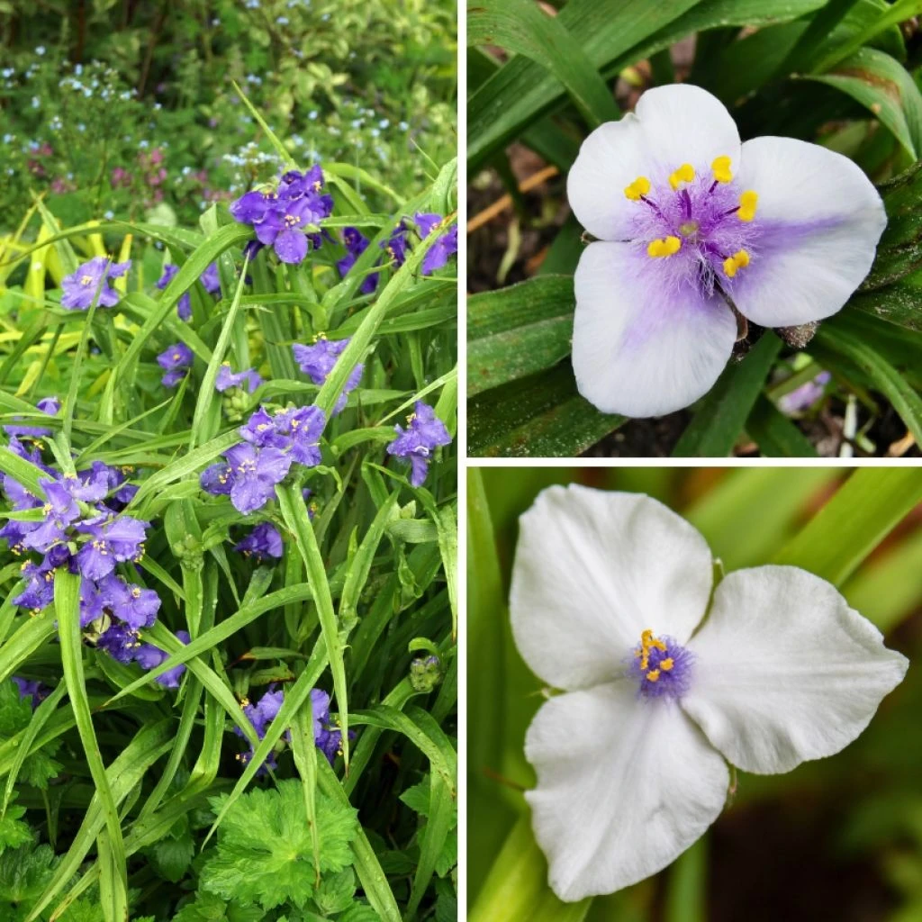 1 x Tradescantia andersoniana ‘Osprey’ : Dotée de fleurs éclatantes, blanc bleuté à centre bleu soutenu, cette variété contraste avec les autres plantes de la collection. Elle atteint une hauteur d’environ 40 cm. Sa floraison peut durer 4 mois, entre mai-juin et octobre, si l’on prend soin de tailler un peu les touffes en cours de saison.