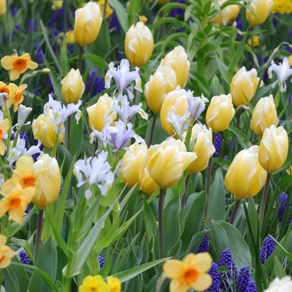Une collection qui met en scène de façon brillante le contraste et l’harmonie en jouant avec la complémentarité des couleurs et des formes de fleurs. Sans oublier le parfum. La tulipe et le narcisses, tous deux dans des tons de jaune, percutent le bleu violacé vif des muscaris, tandis que la fleur de porcelaine de l’iris, d’un blanc lavé de mauve et rehaussée d’or, harmonise l’ensemble. Tous ces bulbes qui fleurissent de concert créent un tableau à la fois joyeux et plein de fraîcheur qui annonce en fanfare le retour du printemps. Ajoutez de la hauteur et du style à votre massif en intercalant des !