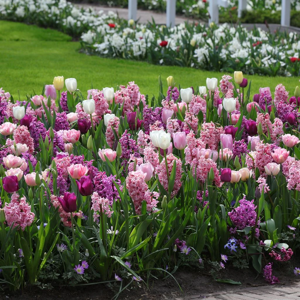Avec cette collection de bulbes, c’est le romantisme qui triomphe au jardin ! C’est une trĂšs belle ambiance, romantique sans ĂȘtre miĂšvre, oĂč les tons roses se rĂ©vĂšlent dans toute leur beautĂ©, magnifiĂ©s par le blanc et sublimĂ©s par le pourpre, le violacĂ©. Sous le soleil printanier s’Ă©panouit un charmant camaĂŻeu, un tableau harmonieux. Les tulipes offrent de la hauteur Ă la scĂšne et l’Ă©lĂ©gance de leurs coupes irisĂ©es, tandis que les jacinthes apportent avec leurs gĂ©nĂ©reux Ă©pis floraux la densitĂ© et le parfum. L’ensemble permet de composer sans difficultĂ© un tableau inoubliable pour fĂȘter en beautĂ© l’arrivĂ©e du printemps. Sublime avec des .