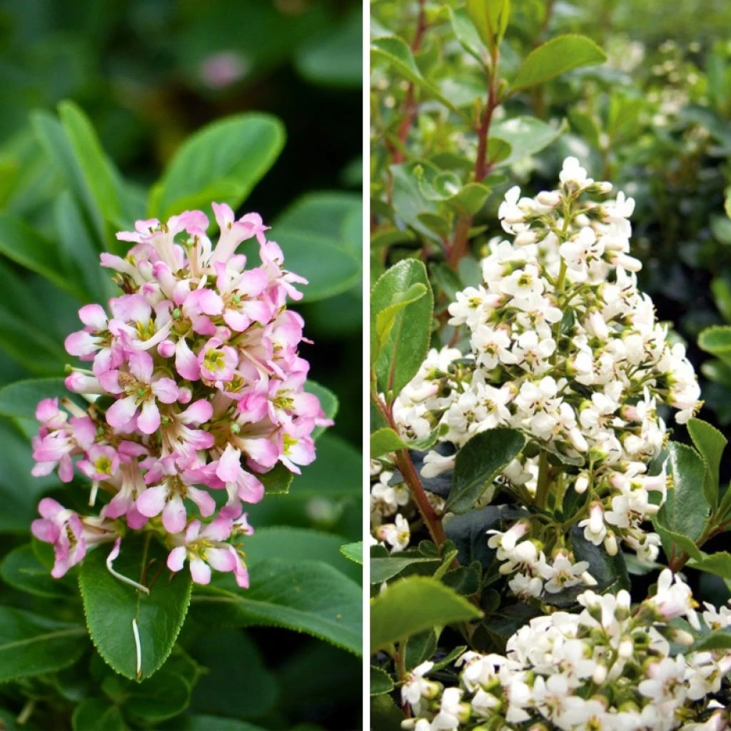 Ce Duo Escallonias rĂ©unit deux excellentes variĂ©tĂ©s d’Escallonia hybrides idĂ©ales pour dĂ©couvrir ces arbustes persistants de climat doux parfaitement adaptĂ©s au bord de mer. ‘Iveyi’ est un vigoureux arbuste de haie qui produit des fleurs blanches lĂ©gĂšrement parfumĂ©es, tandis que ‘Pink Elle’, au dĂ©veloppement rĂ©duit et aux fleurs roses, est une plante « dĂ©co », facile Ă modeler, parfaite dans un joli pot sur la terrasse ou dans un massif bas. Culture au soleil ou Ă mi-ombre, dans tout sol drainĂ© pas trop calcaire.
