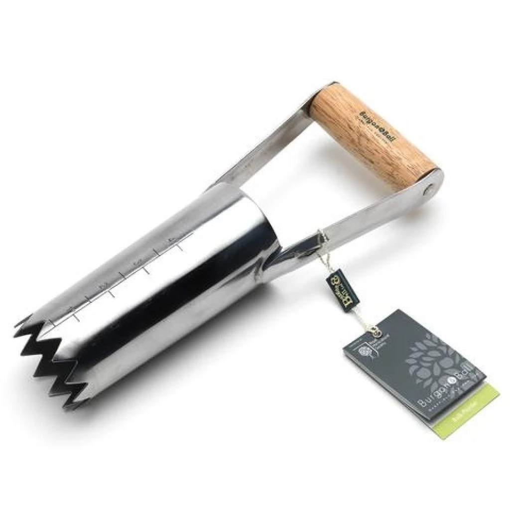 Le plantoir à bulbes à poignée Burgon & Ball facilite grandement la plantation de bulbes. Enfoncez simplement le plantoir à bulbes dans le sol à la profondeur requise, grâce aux graduations. Utilisez la poignée pour tordre le plantoir, la lame dentelée facilite considérablement la pénétration dans le sol en enlevant un bouchon de terre, et insérez votre bulbe dans le trou (extrémité pointue vers le haut!). Passez à la réalisation du trou suivant, et ce faisant, le bouchon de terre du premier trou est poussé hors du plantoir. Prenez ce bouchon et remettez-le dans son trou d’origine, au-dessus de votre bulbe. Répétez autant de fois que nécessaire!