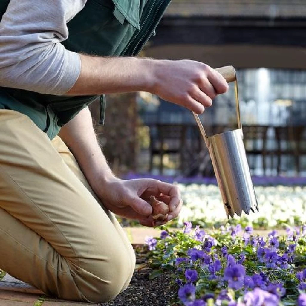 La plantation de bulbes se fait souvent en groupes ou en masse pour produire des taches denses et bien colorées dans le jardin. Ils nécessitent d’être enterrés à une profondeur de plantation spécifique, correspondant souvent à deux fois la hauteur du bulbe planté voire plus. C’est un travail qui peut s’avérer très fastidieux, parce qu’il nécessite d’opérer près du sol, et induit des gestes répétitifs lorsqu’il s’agit de garnir de grands massifs et de longues bordures. Le plantoir à bulbes est l’outil le plus adapté pour planter les bulbes rapidement et précisément, et il doit être choisi soigneusement selon la taille des bulbes et les exigences de chaque jardinier. Le corps du plantoir (sa tête) sert à :
