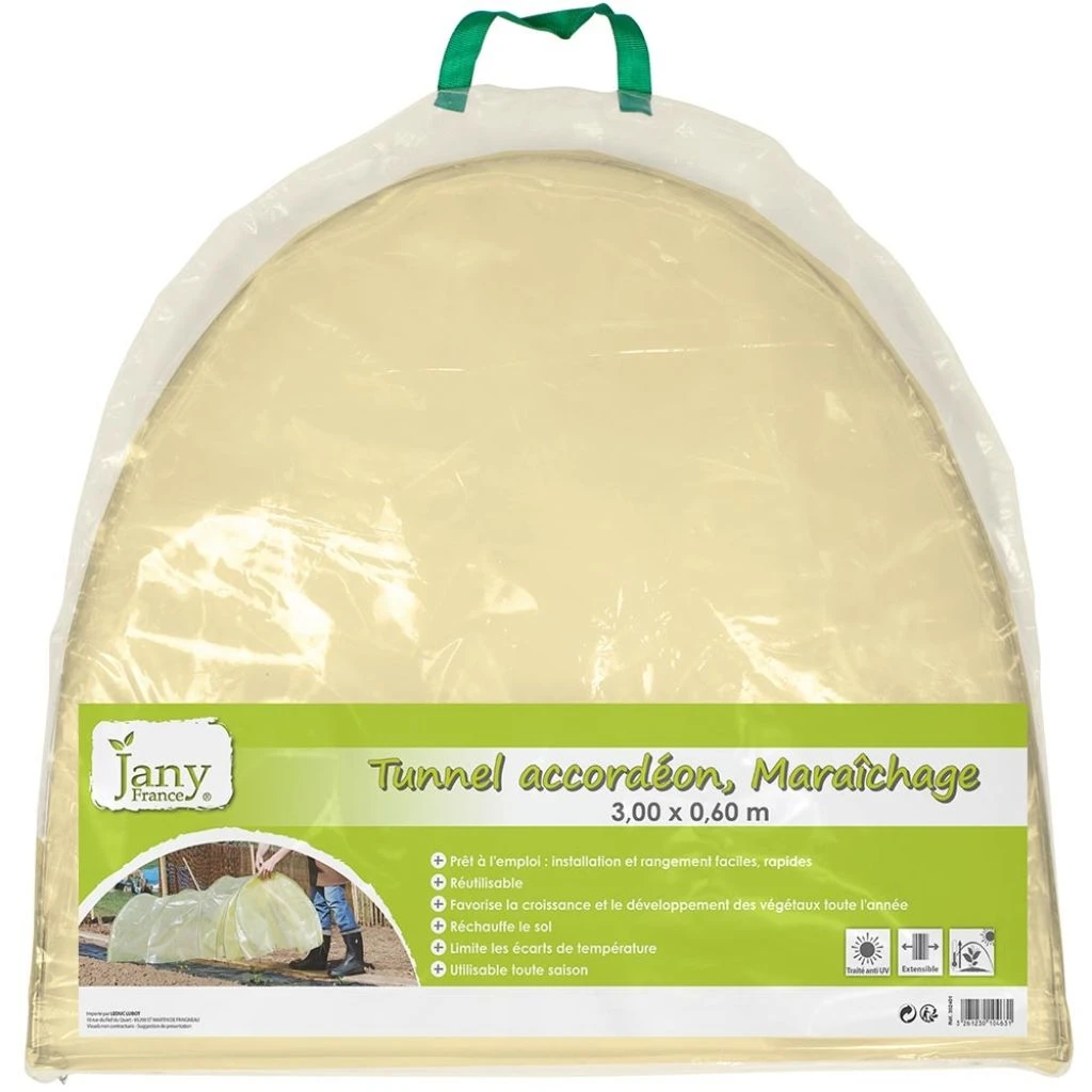 Ce tunnel en accordéon pour maraîchage est un dispositif de qualité, prêt à l’emploi, à la fois efficace et d’un usage aisé, conçu pour tous les jardiniers, même débutants. Il a pour objectif de protéger les semis et les plantes du foid, afin d’accélérer la levée et la croissance des plantes pour in fine avancer les récoltes, en particulier dans les régions où le printemps tarde à s’installer. Ce dispositif est composé d’un film en polyéthylène translucide de qualité supérieure, de couleur vert clair pour filtrer la lumière, avec arceaux intégrés. Le système d’accordéon permet d’adapter sa longueur en fonction de la taille du jardin et de le replier complètement pour le ranger.